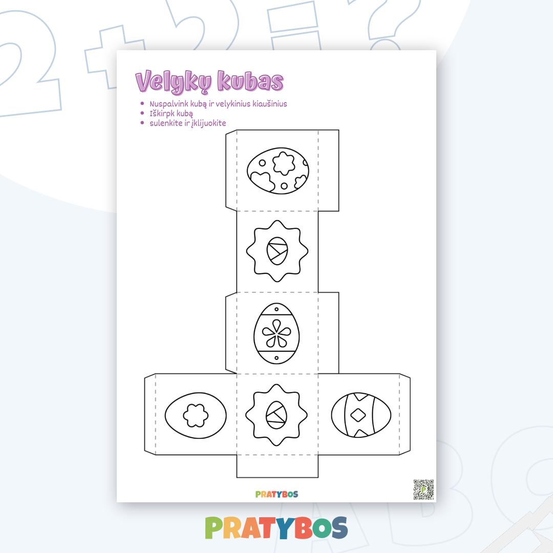 „Velykų kubas“ – tai kūrybiška užduotis, kurioje vaikai nuspalvina detales, iškerpa pagal kontūrą ir sulankstę suklijuoja erdvinį kubą. ✂️🎨