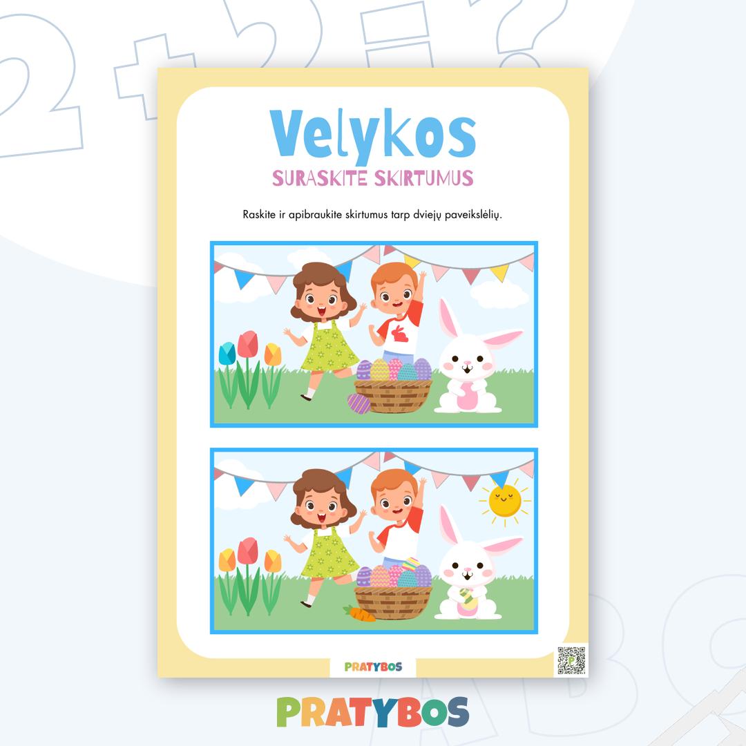 Šios velykinės pratybos kviečia vaikus ieškoti ir apibraukti skirtumus tarp paveikslėlių 🐣✨ Smagi užduotis padeda lavinti pastabumą, dėmesio koncentraciją ir vizualinį suvokimą.