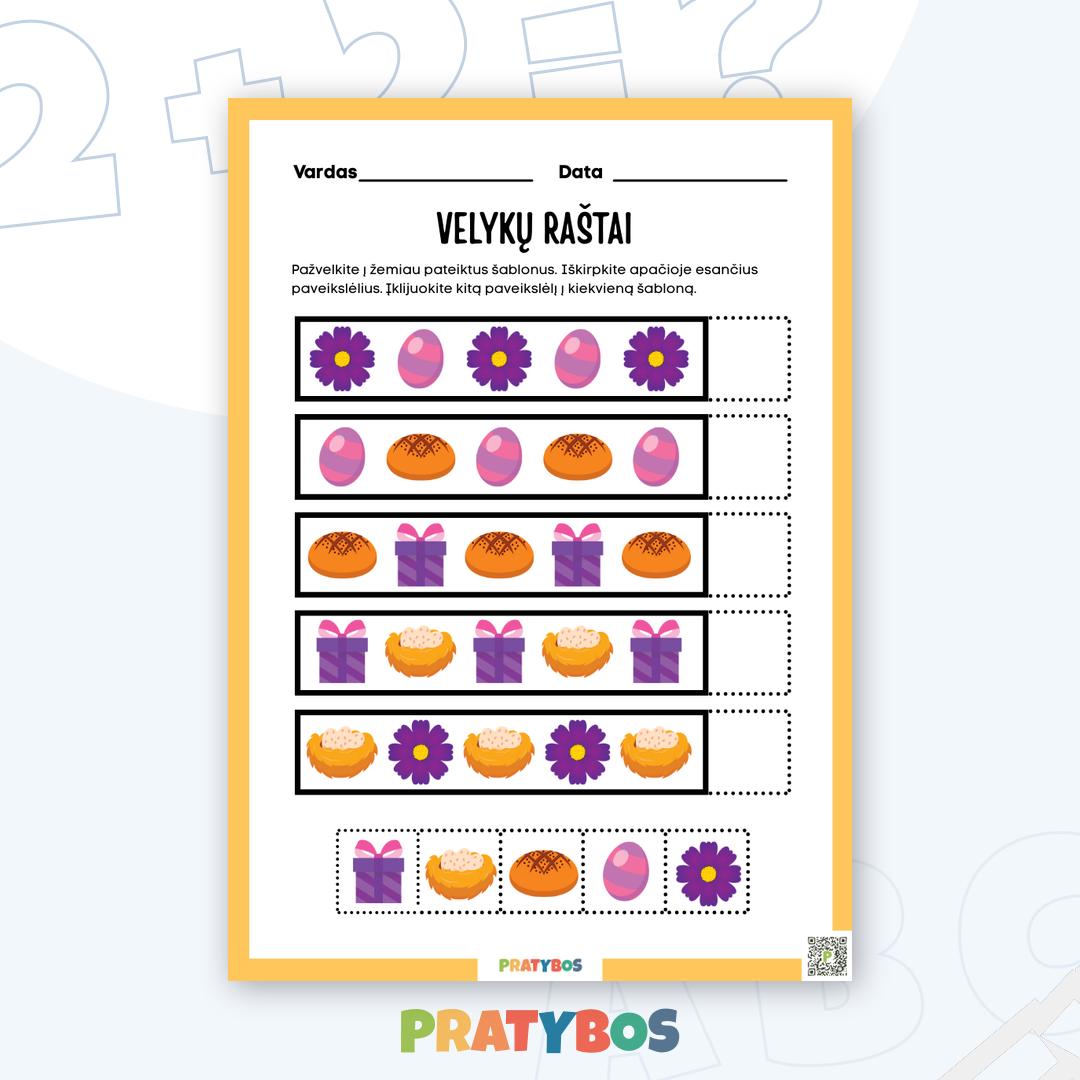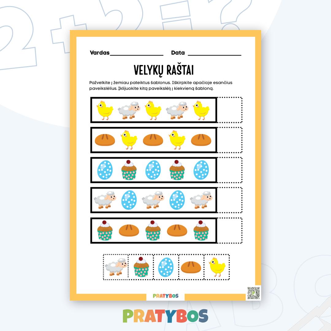 „Velykų raštai“ – tai smagios pratybos, kuriose vaikai stebi pasikartojančias sekas ir užbaigia raštus, įklijuodami tinkamą paveikslėlį ✂️📌