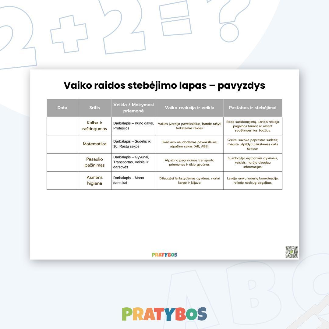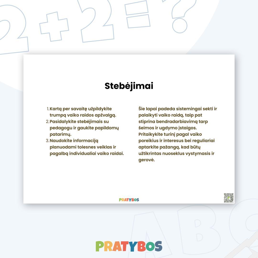 Šis stebėjimo lapas padeda sistemingai sekti ir palaikyti vaiko raidą. Stebėjimai stiprina bendradarbiavimą tarp šeimos ir ugdymo įstaigos. 🏡👨👩👧👦