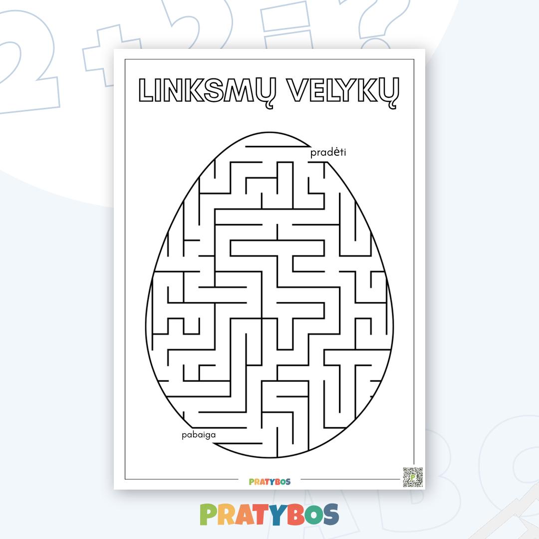 „Linksmų Velykų“ labirintas – tai smagi kiaušinio formos užduotis, kurioje vaikas turi rasti kelią nuo „pradėti“ iki „pabaiga“ 🐣✨