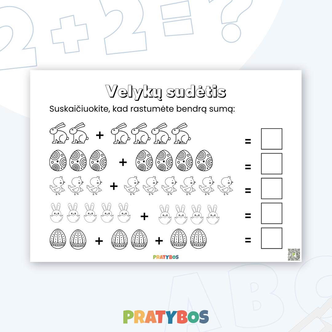 Linksmas „Velykų sudėties“ lapas padeda vaikams mokytis sudėties skaičiuojant zuikius, margučius ir viščiukus 🐣➕