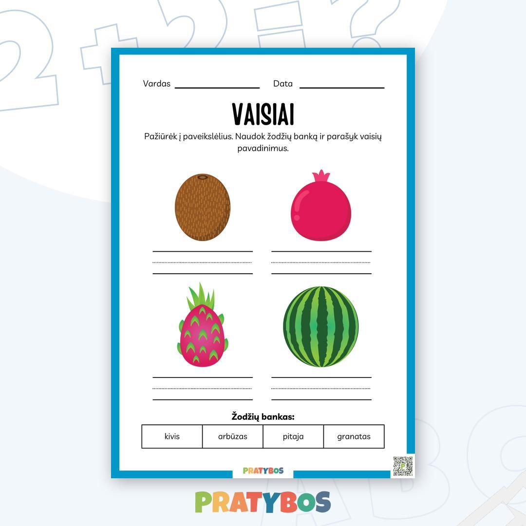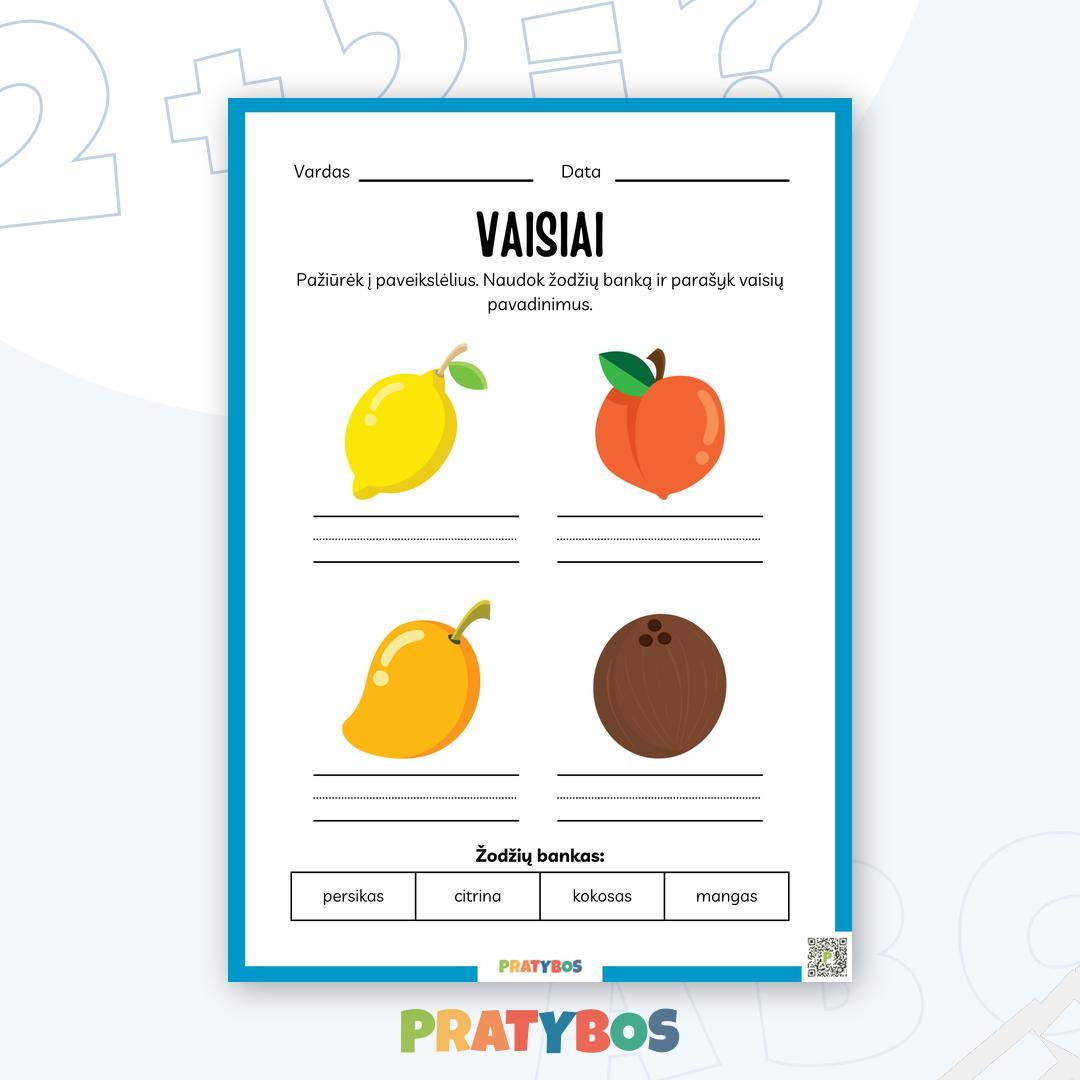 Šis užduočių sąsiuvinis padės vaikams išmokti vaisių pavadinimus per smagius ir įtraukiančius pratimus. 📝🍊